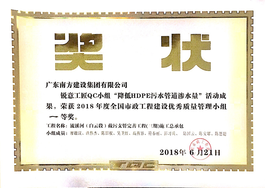 • 南方-2018年度全國市政工程建設優(yōu)秀質量管理小組一等獎