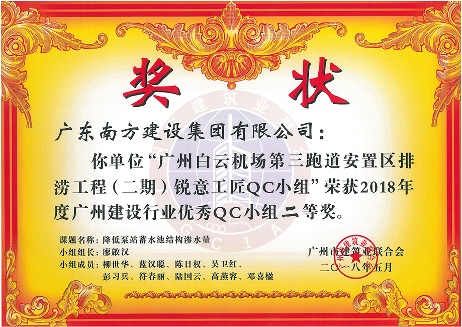 南方-2018年度廣州建設行業(yè)優(yōu)秀QC小組二等獎